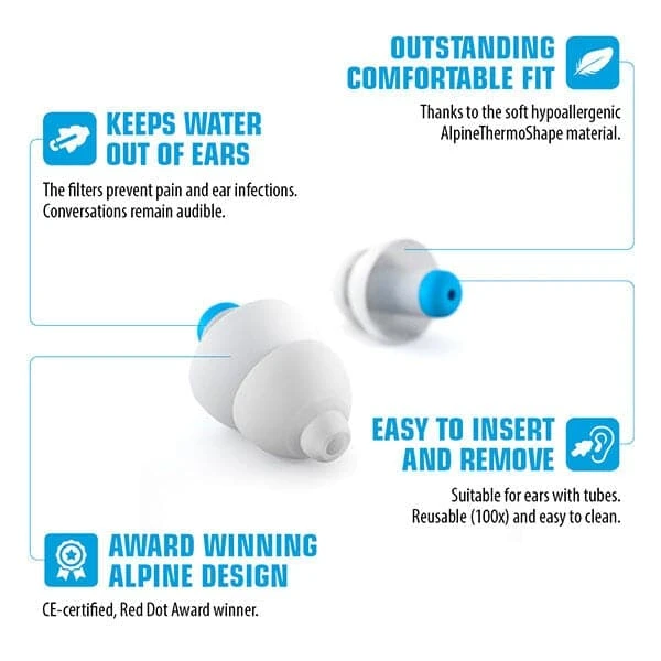 Enjoy more fun in and on the water with Alpine SwimSafe Earplugs. These special swimming hearing protectors prevent water getting into your ears, for example, if you have an ear infection, or want to prevent one. Thanks to the unique filters, you can still hear virtually everything.