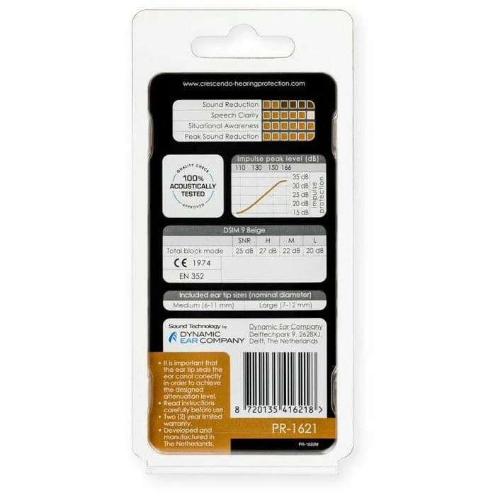 Developed for military use, the Crescendo Hunting 10-30 is ANSI IPIL certified for impulse noise up to 166 dB where it provides 33 dB of attenuation. Crescendo Hunting ear plugs reduces peak sound pressure level produced by automatic fire and single gun shots, artillery fire and explosions.