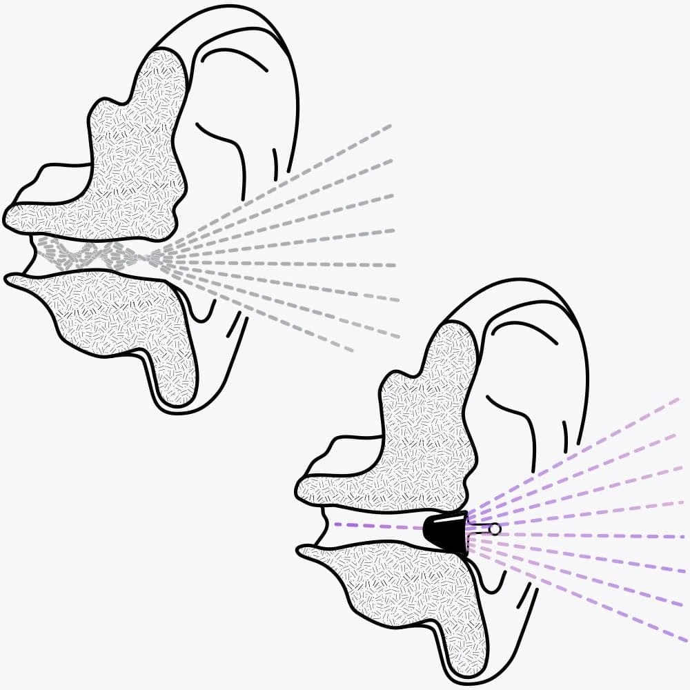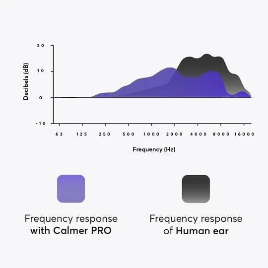 Calmer PRO removes the resonant effect of the Concha by using a tiny waveguide inside our ears. The Concha is the small shell shape that connects to our ear canal which normally resonates mid frequency sounds.