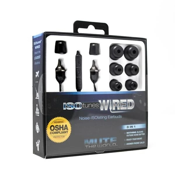 ISOtunes WIRED comes with 4 pairs of ISOtunes TRILOGYâ„¢ foam eartips, 2 pairs of silicone triple-flange eartips, 2 pairs of silicone single-flange eartips, and a snap-shut travel carrier.