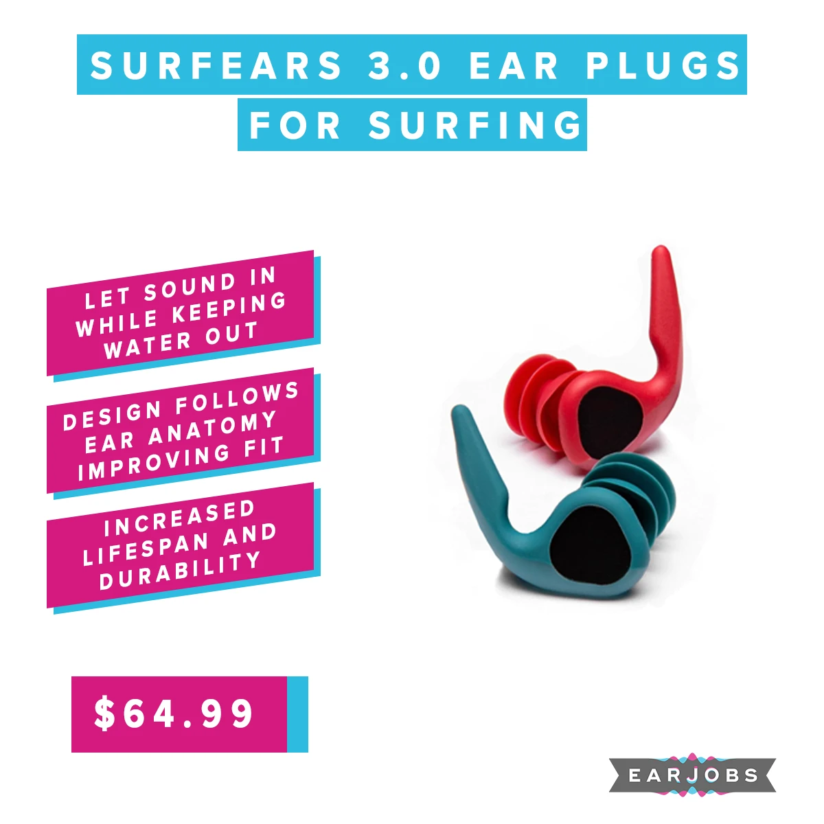 Introducing the brand new SurfEars 3.0, the world’s only ear plug that helps your ears without affecting your hearing. Designed to let sound in while keeping water out, utilizing unique acoustic mesh specifically developed to block out water, cold air, dirt and bacteria and elements that are known to create common issues like ear inflammation or bone growth in the ear canal known as surfers ear.